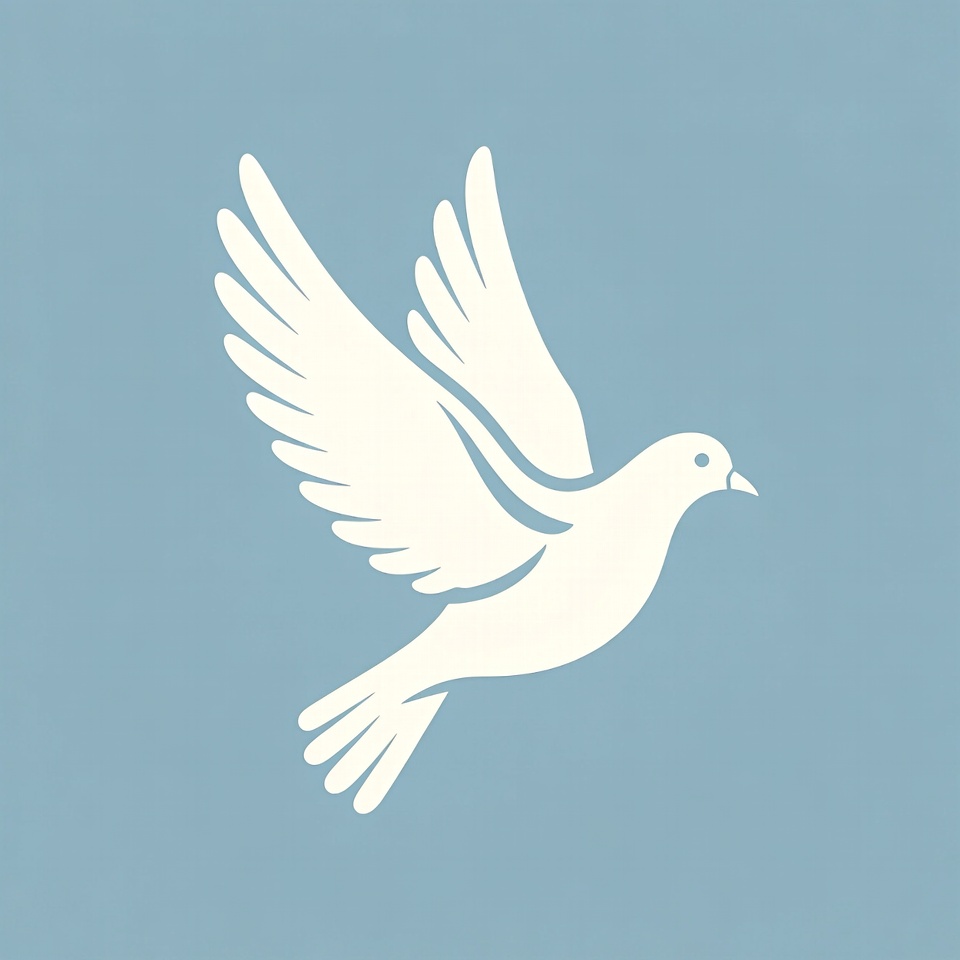A simple white dove with outstretched wings flies against a solid light blue background. The illustration features clean lines and a minimalist design. The dove faces right with a small beak and tail feathers visible.