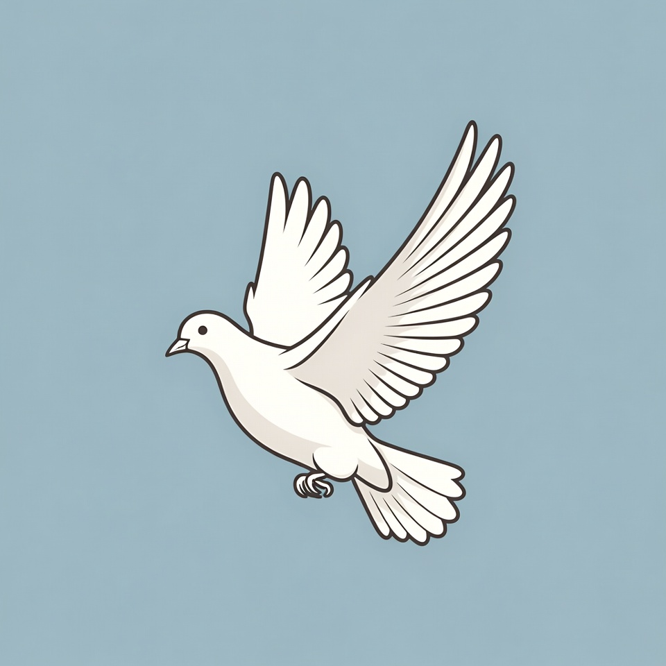 A simple white dove with outstretched wings flies against a light blue background. The illustration features clean black outlines and a peaceful design. The bird's feathers and details are rendered in a minimalist cartoon style.