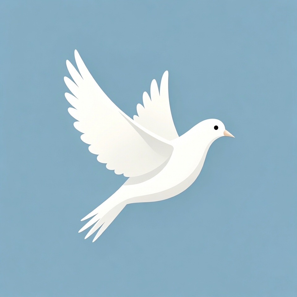 A simple white dove with spread wings flies across a solid light blue background. The illustration features detailed white feathers, a small black eye, and a yellow beak. It is depicted in a dynamic flying pose with tail feathers extended.