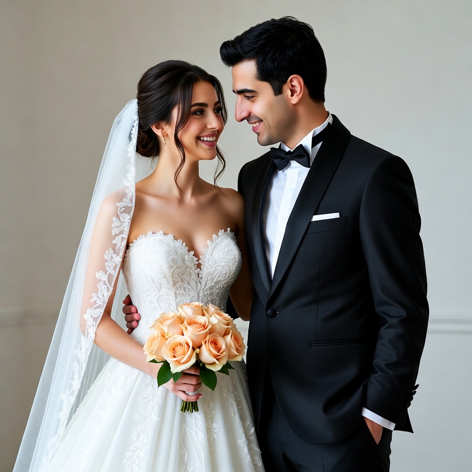 Middle Eastern, black tuxedo, bouquet, bow tie, couple, groom, lace gown, man, orange roses, smiling, veil, wedding, white dress, woman, bride