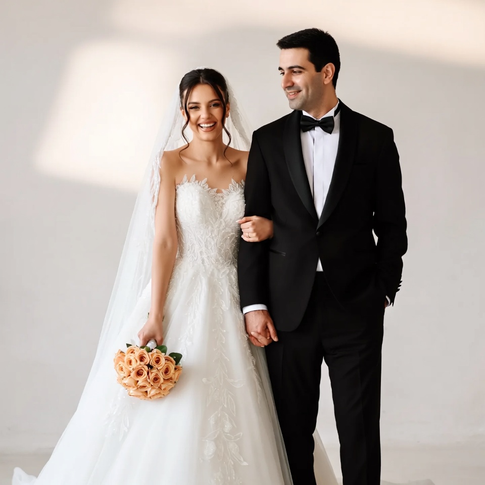 Middle Eastern, black tuxedo, bouquet, bow tie, couple, elegant, formal wear, groom, happy, holding hands, lace gown, man, marriage, newlyweds, orange roses, portrait, smiling, studio, veil, wedding, wedding gown, white background, white dress, woman, bride