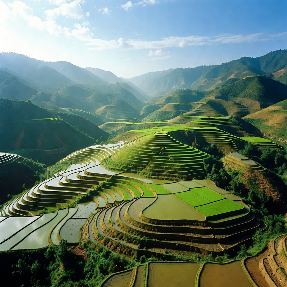 Asia, aerial view, agriculture, clouds, crops, earth, farming, fields, green fields, hills, landscape, layers, mist, mountains, nature, paddies, rice paddies, rural, scenery, sky, slopes, terraced fields, valleys, vegetation, water, rice terraces