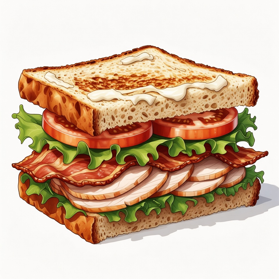 A colorful illustration of a stacked BLT sandwich features toasted bread slices with crisp bacon, sliced turkey, fresh lettuce, and red tomato slices. Lettuce leaves protrude from the sides, and mayonnaise spreads on the top bread. The sandwich is depicted on a white isolated background.