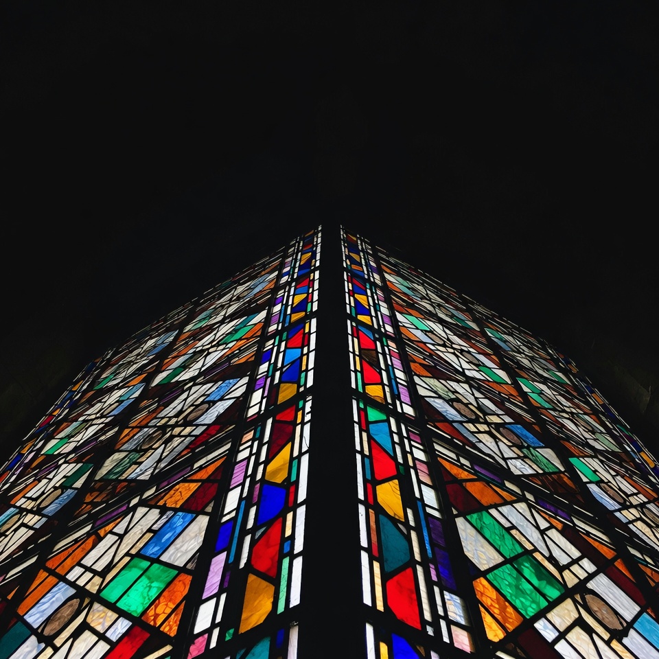A tall stained glass window forms a towering structure against a dark background. Vibrant panels in red, blue, green, yellow, and purple create intricate geometric patterns. The low-angle shot emphasizes its height and colorful glow.