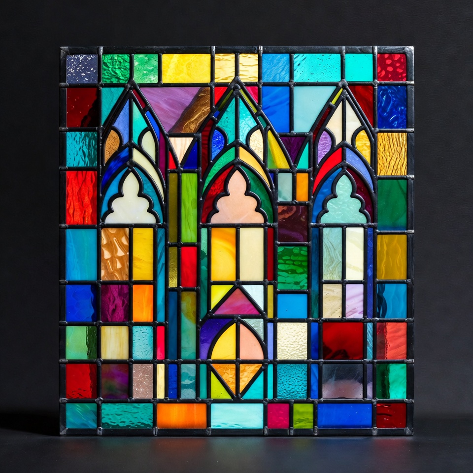 A vibrant stained glass panel features three tall Gothic arched windows in a square frame. It displays a mosaic of multicolored glass pieces in blues, reds, yellows, purples, and greens. The design is set against a solid black background.