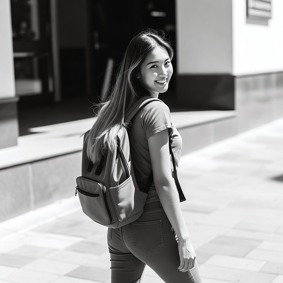 A young Asian woman with long straight hair walks away from the camera on a sunny urban sidewalk. She wears a gray t-shirt, tight jeans, and carries a black backpack over both shoulders. The background features a modern building entrance with glass doors and an American flag.