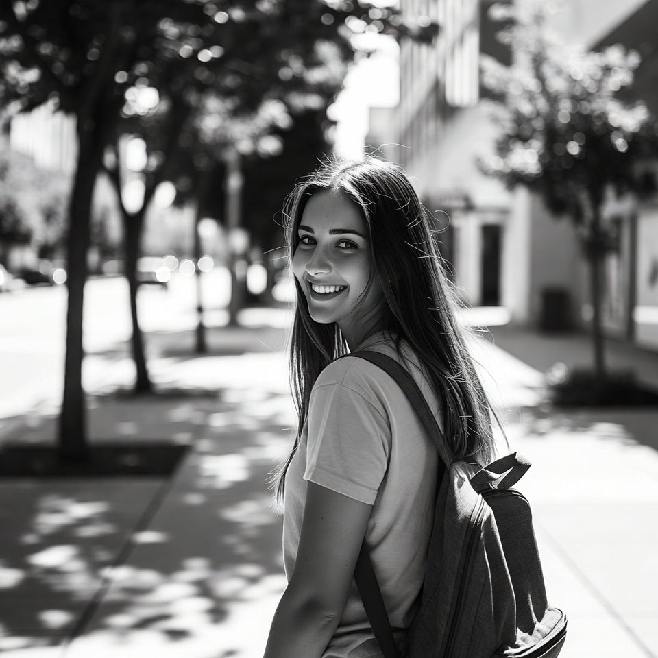 A young woman with long dark hair smiles over her shoulder while walking on a tree-lined urban sidewalk. She wears a light t-shirt and carries a backpack with shoulder straps. Sunlight filters through the trees, casting shadows on the modern buildings and pavement behind her.