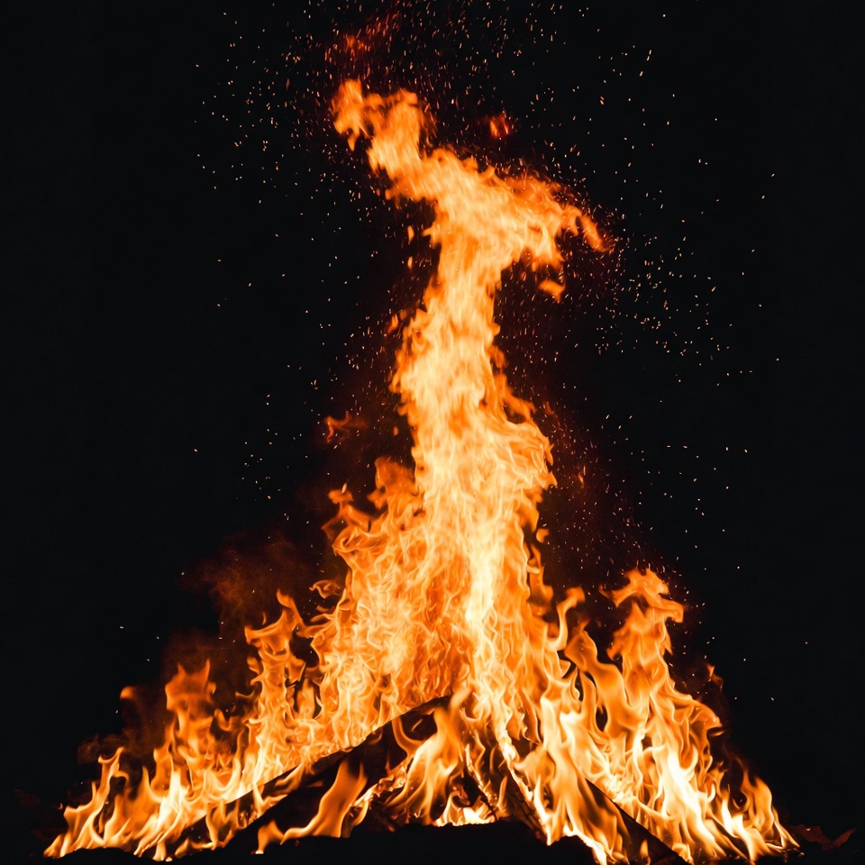 black background, blaze, burning, campfire, combustion, dark backdrop, embers, fiery, fire, flame burst, flames, glow, heat, inferno, isolated background, orange flames, pyre, sparks, yellow fire, bonfire
