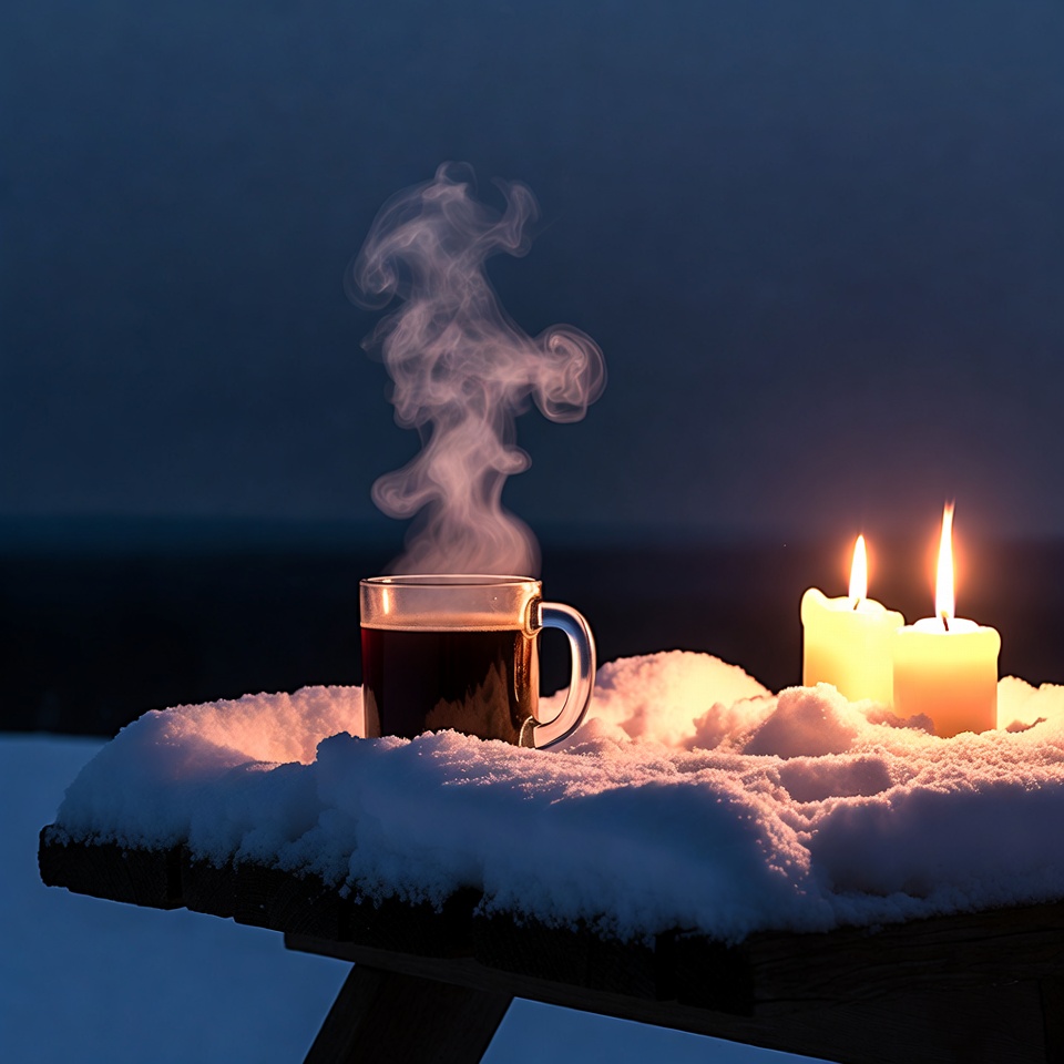beverage, candlelight, candles, cozy, dark tea, flame, frosty snow, glass cup, hot drink, lit candles, night, snow, snowy table, steam, swirling steam, tea cup, winter, winter night, wooden table, hot tea