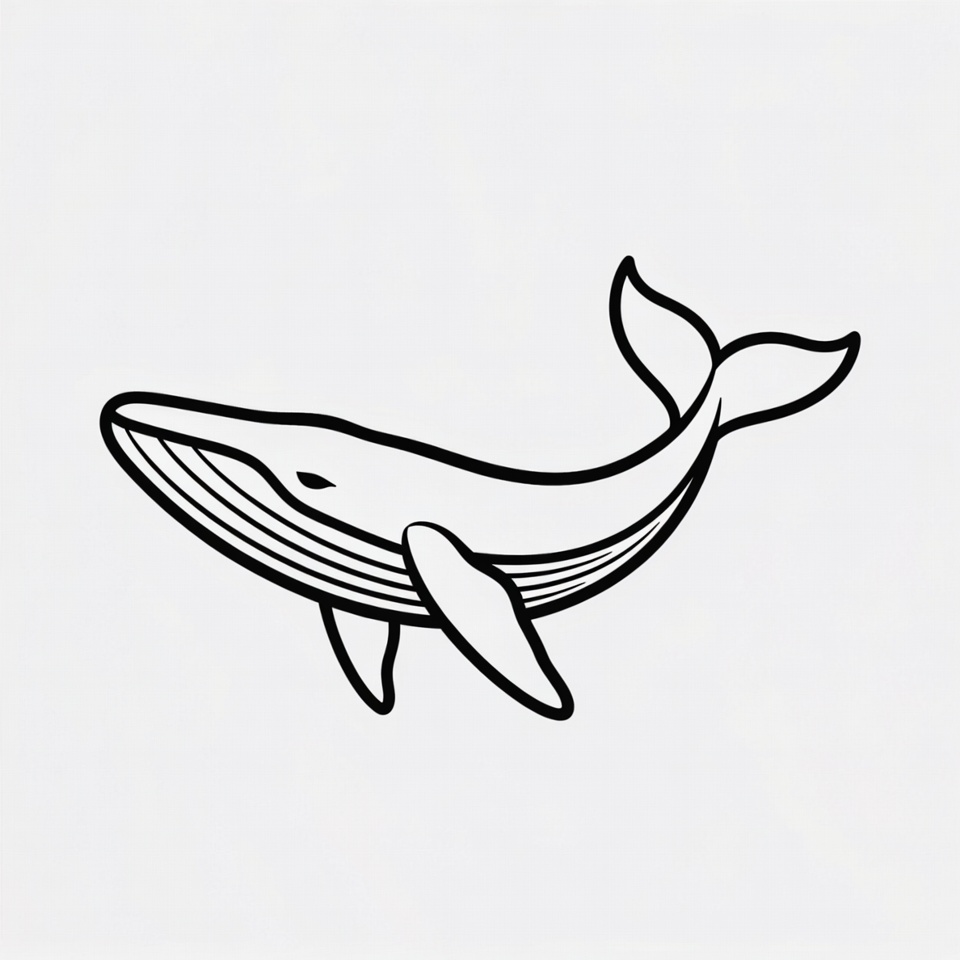 A simple black line drawing of a humpback whale swims gracefully on a white background. The illustration features detailed outlines of the whale's distinctive body, fins, tail, and baleen grooves along its throat. It is presented in a minimalist clipart style suitable for coloring or vector use.