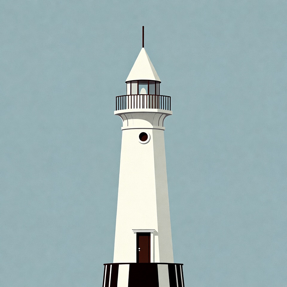 A minimalist illustration of a tall white lighthouse with a pointed roof and lantern room stands against a light blue background. It features a brown door at the base, a circular window on the tower, and black stripes on the foundation. Railings surround the observation deck.