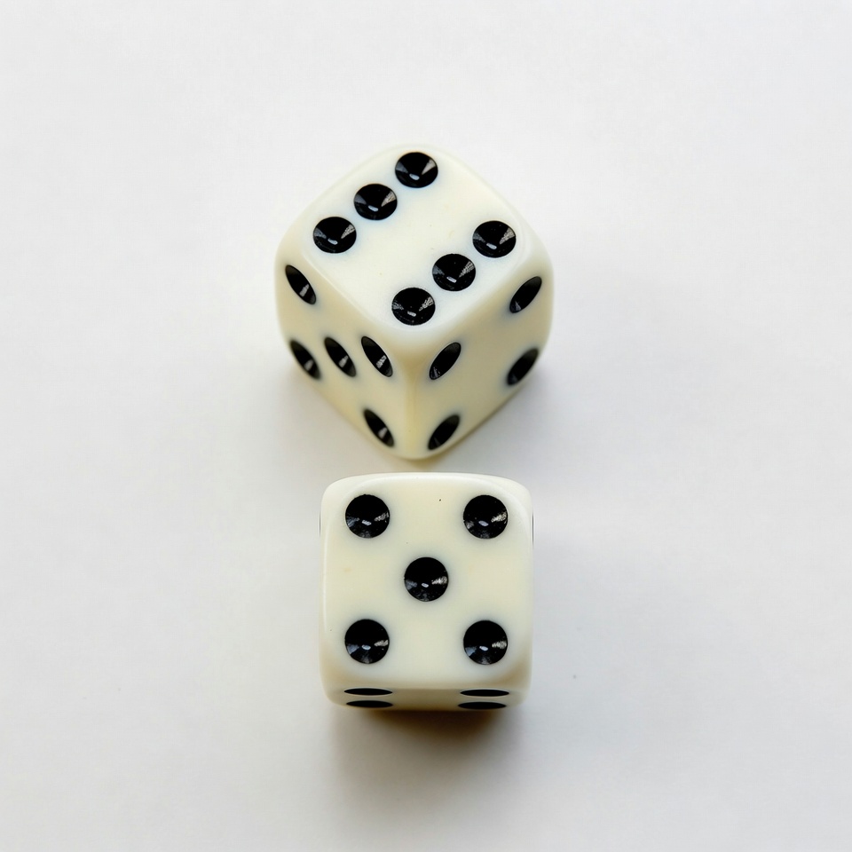 Two standard white six-sided dice with black dots are placed on a plain white surface. One die shows five pips on top, while the other shows three pips. They are positioned side by side with a slight overlap in view.