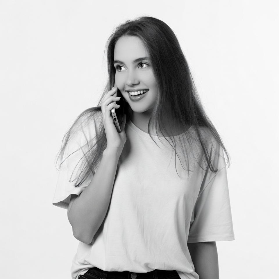 A young woman with long brown hair smiles while talking on her smartphone. She wears a loose white t-shirt and dark pants, standing against a white background. The image is in black and white.