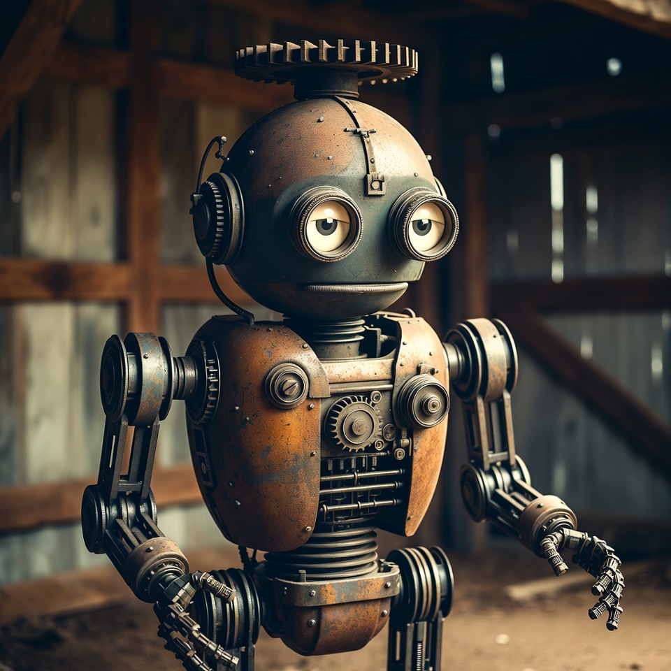 automaton, barn, barn interior, cogwheel, crown, cyberpunk, gears, headphones, illustration, industrial, large eyes, machine, mechanical, retro robot, robot arms, robot hands, rusty metal, rusty robot, sci-fi, steampunk, steampunk robot, vintage robot, wood background, wooden barn, robot