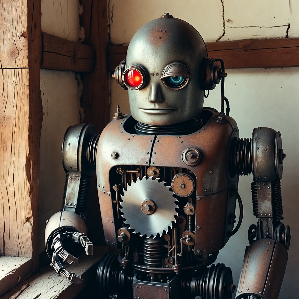 automaton, blue eyes, bronze, claws, cyberpunk, gears, goggles, industrial, isolated background, machinery, mechanical, metallic, red eyes, rustic window, saw blade, sci-fi, steampunk, vintage robot, wooden frame, robot