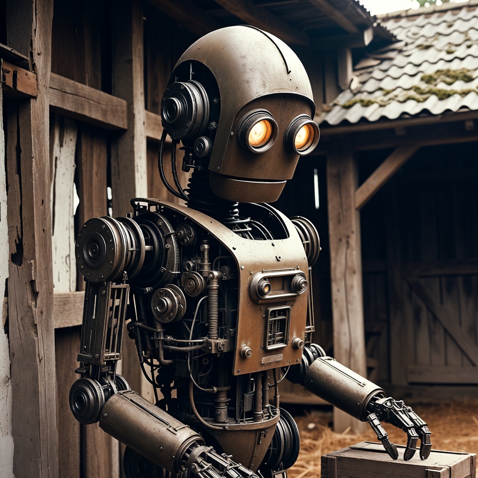 android, barn, gears, glowing eyes, isolated background, machinery, mechanical, metal robot, rustic shed, sci-fi, steampunk, vintage robot, wires, wooden crate, wooden walls, robot