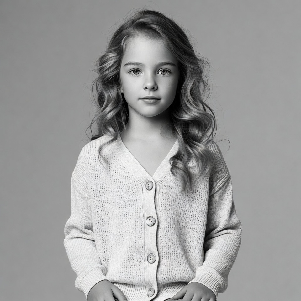 A young girl with long curly hair stands against a gray background. She wears a white knit cardigan with buttons and looks directly at the camera. Her expression is neutral with hands clasped in front.