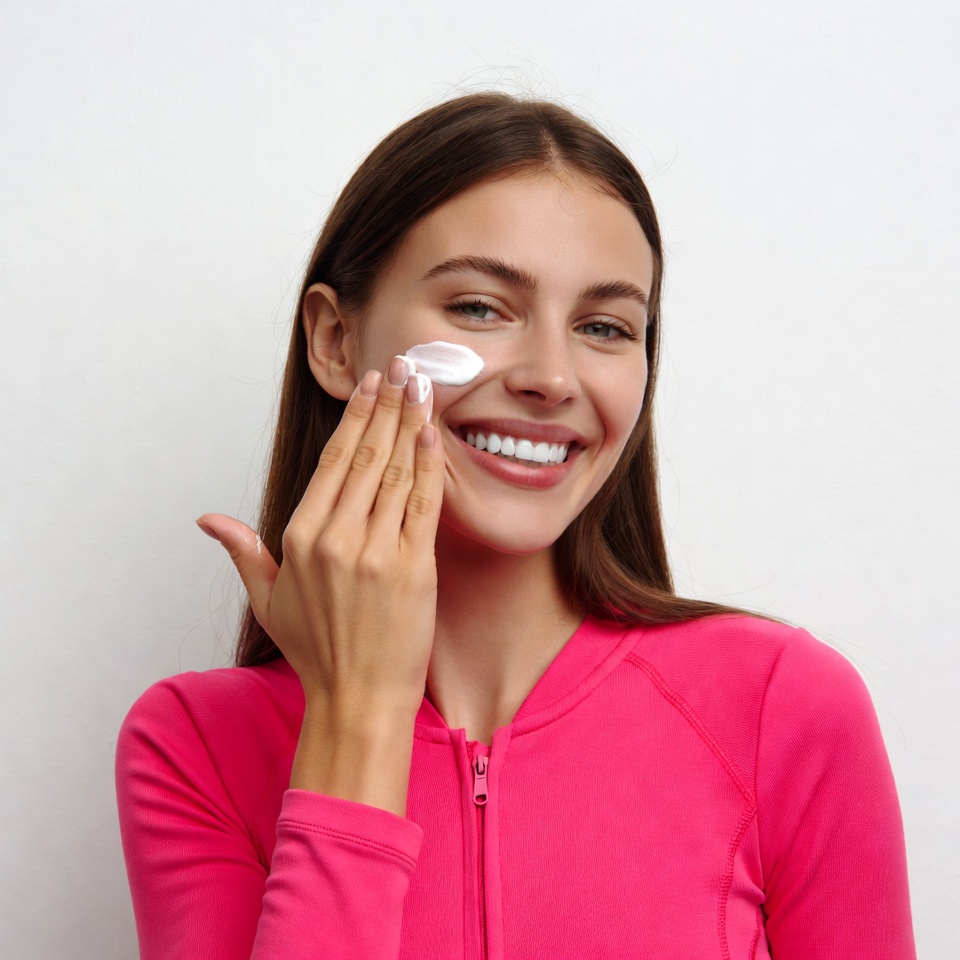 A young woman with long brown hair smiles while applying white skincare cream to her cheek with her hand. She wears a pink zip-up jacket and stands against a plain white background. Her eyes are focused and her expression is happy.