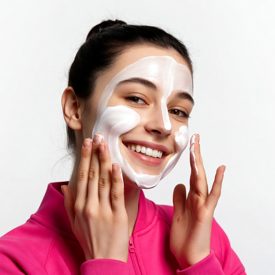 A young Asian woman with dark hair in a bun applies white face mask cream to her face. She wears a pink jacket and smiles happily with her hands framing her face. The image is set against a plain white background.