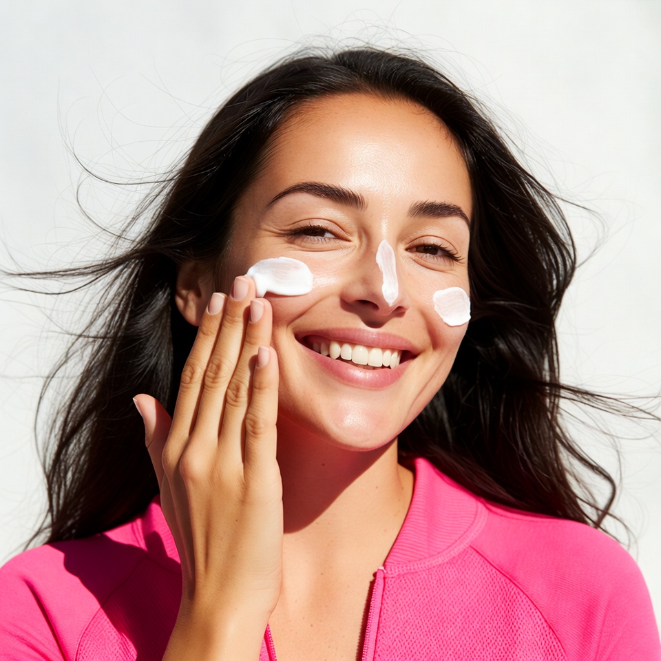 A young woman with long dark hair smiles while applying white sunscreen cream to her face. She wears a pink jacket and stands against a plain white background. Her eyes are squinted happily with cream visible on her cheeks and nose.