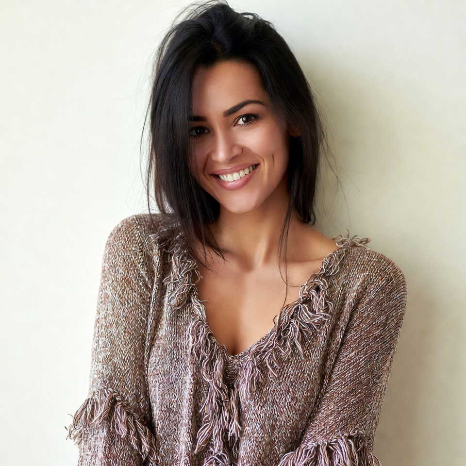 A woman with long, tousled dark hair smiles warmly at the camera against a plain white background. She wears a brown knit sweater with fringed edges and a deep V-neckline. Her expression is joyful with bright eyes and full lips.