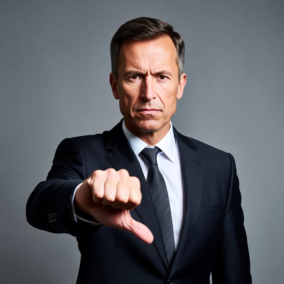 White, business suit, businessman, clenched fist, dark suit, disapproval, gray background, hand gesture, male, middle-aged, no gesture, pointing, portrait, professional, serious face, stern expression, suit, thumbs down, tie, man