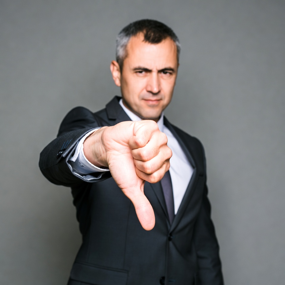 A middle-aged man with short gray hair and a serious expression stands against a gray background. He wears a dark suit, white shirt, and tie while extending his arm with a thumbs down hand gesture. His face shows disapproval as he points downward with his thumb.