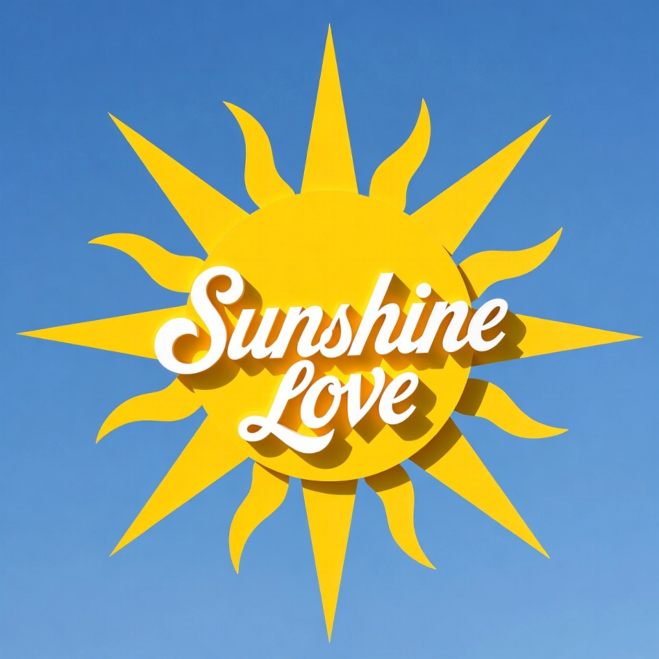 A vibrant yellow sun with radiating rays features the text 'Sunshine Love' in white cursive letters on a bright blue background. The design is bold and graphic with a 3D effect on the letters. It appears as a digital illustration or clipart.