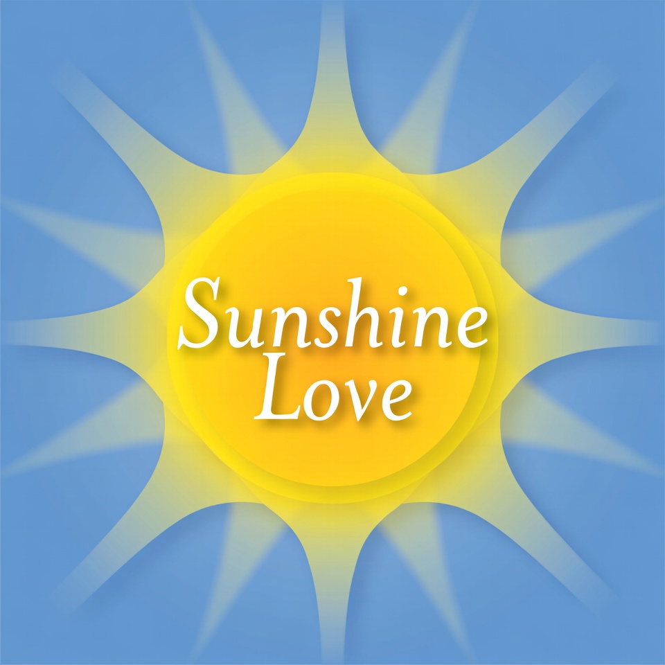 A vibrant yellow sun with radiating rays is centered on a blue background. The words 'Sunshine' and 'Love' are overlaid in white elegant font across the sun. The design features a glowing, illustrative style with soft gradients.
