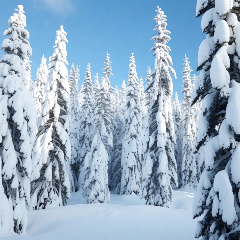A dense forest of tall pine trees covered in heavy snow stands under a clear blue sky. The ground is blanketed in deep white snow, with trees densely packed in the scene. Snow clings to the branches, creating a pristine winter landscape.