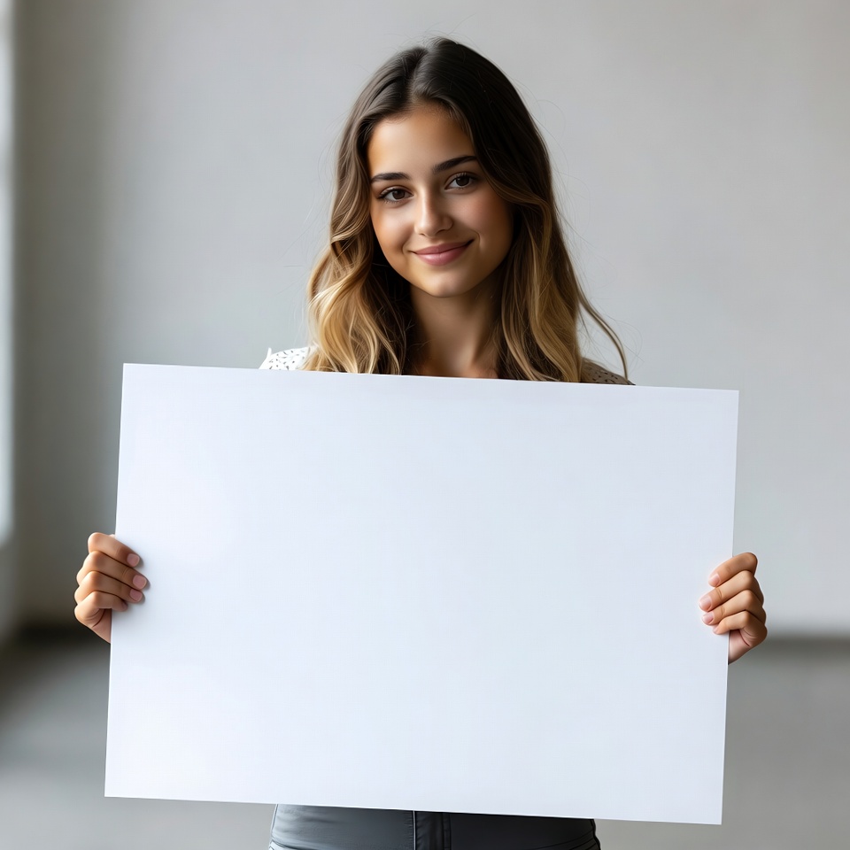 A young woman with wavy brown hair smiles at the camera while holding a large blank white sign in front of her. She wears a light-colored top and gray pants, standing in a bright indoor space with a window. Her expression is friendly and approachable.