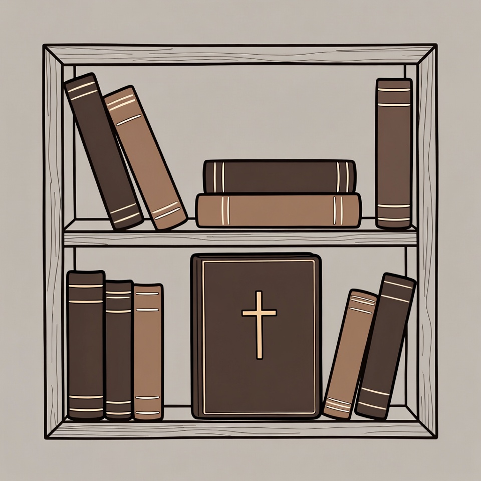 Bible, Christian book, book collection, books, brown books, clipart style, cross, faith symbol, gold cross, illustration, isolated background, library shelf, line drawing, religious book, scripture book, tan books, wooden shelf, bookshelf
