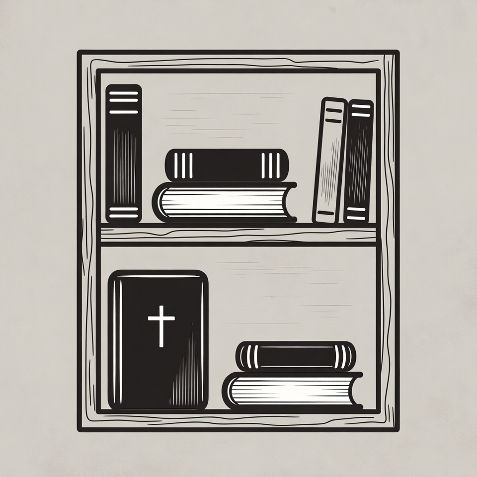 A simple line art illustration depicts a wooden bookshelf with two shelves filled with various books. The bottom shelf prominently features a large open Bible with a Christian cross symbol on its cover, surrounded by stacked books in black and white outlines. The top shelf holds several upright and stacked books against a light gray background.