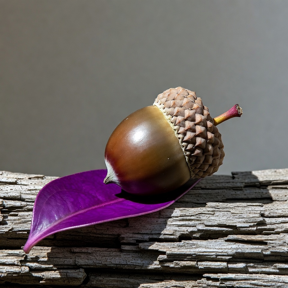A shiny brown acorn with a textured cap rests on a vibrant purple leaf. The leaf lies on a weathered wooden surface with subtle shadows. The acorn's stem points slightly upward.