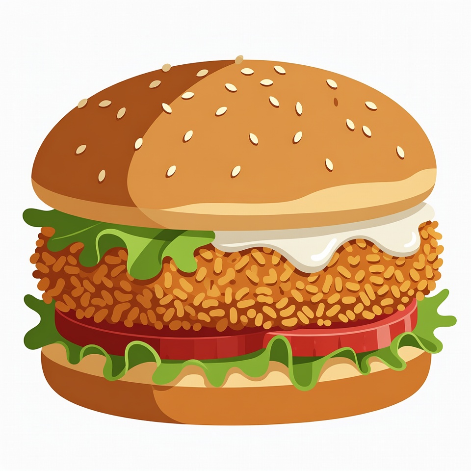 A colorful cartoon illustration of a chicken burger on a white background. The burger features a sesame seed bun, crispy breaded chicken patty, fresh lettuce, tomato slices, and white sauce. It is depicted in a vibrant, appetizing style with detailed textures.