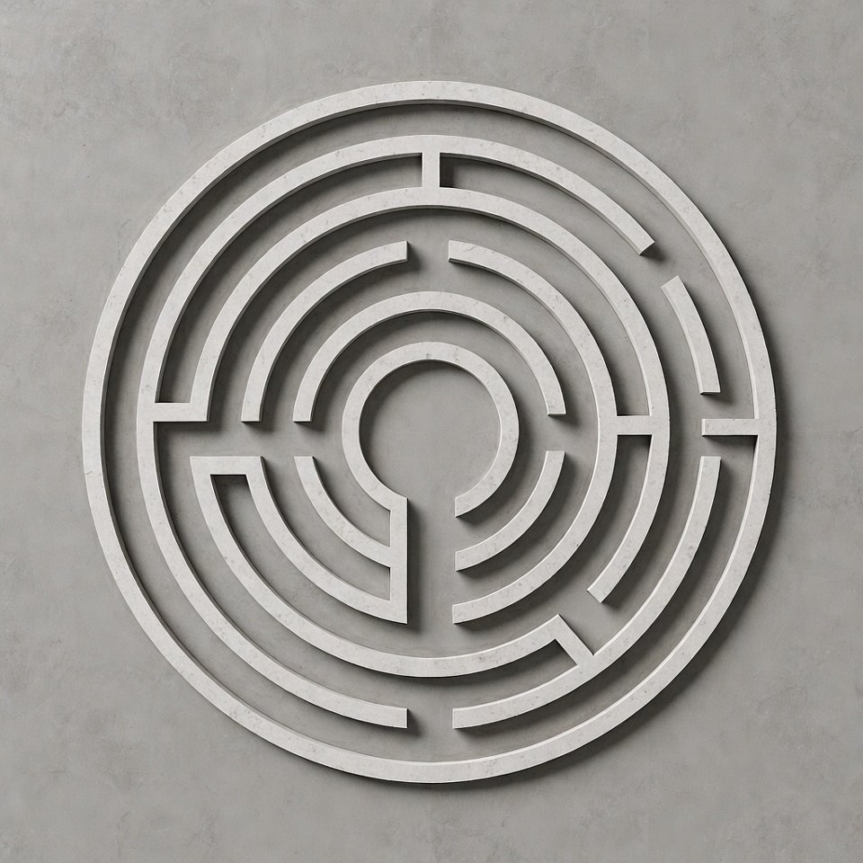 A three-dimensional white maze forms a perfect circle with intricate pathways and walls. The labyrinth features a central open circle and an outer entrance. It is rendered against a smooth gray background.