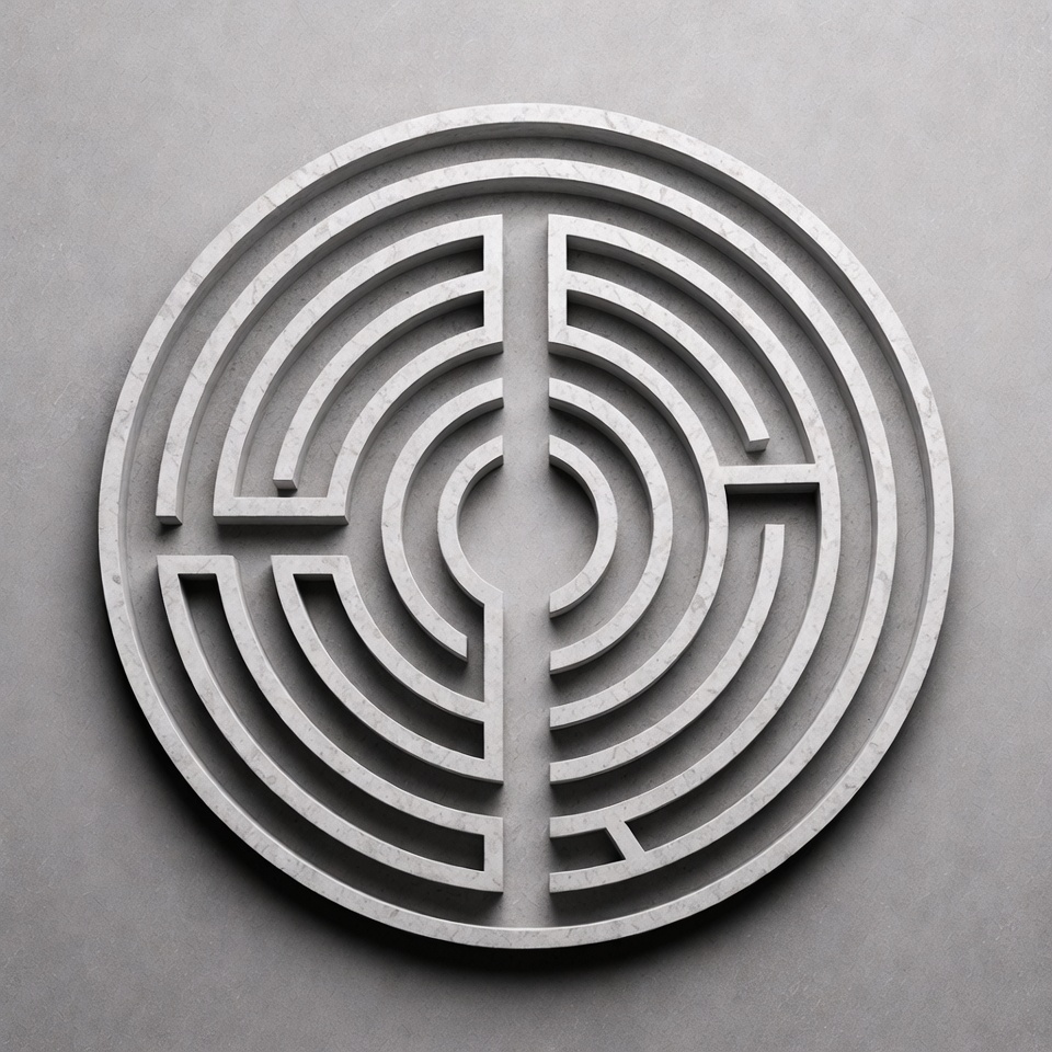 A three-dimensional circular labyrinth is crafted from white marble with intricate pathways and walls. The maze features a central open circle and symmetrical paths radiating outward. It is presented on a plain gray background.