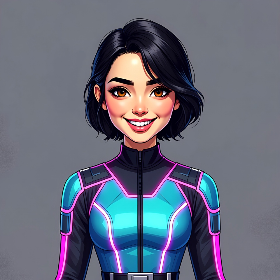 A digital illustration of a smiling Asian woman with short black hair and large expressive eyes. She wears a futuristic black jumpsuit with glowing neon blue and pink accents and shoulder pads. The character stands against a plain gray background.