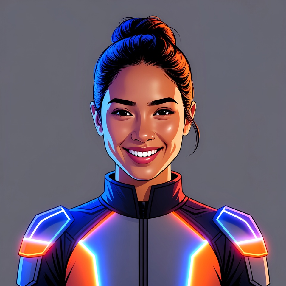 A young Asian woman with dark hair in a bun smiles warmly at the viewer. She wears a high-tech futuristic suit featuring neon blue and orange glowing accents on the shoulders and collar. The illustration is set against a plain gray background.