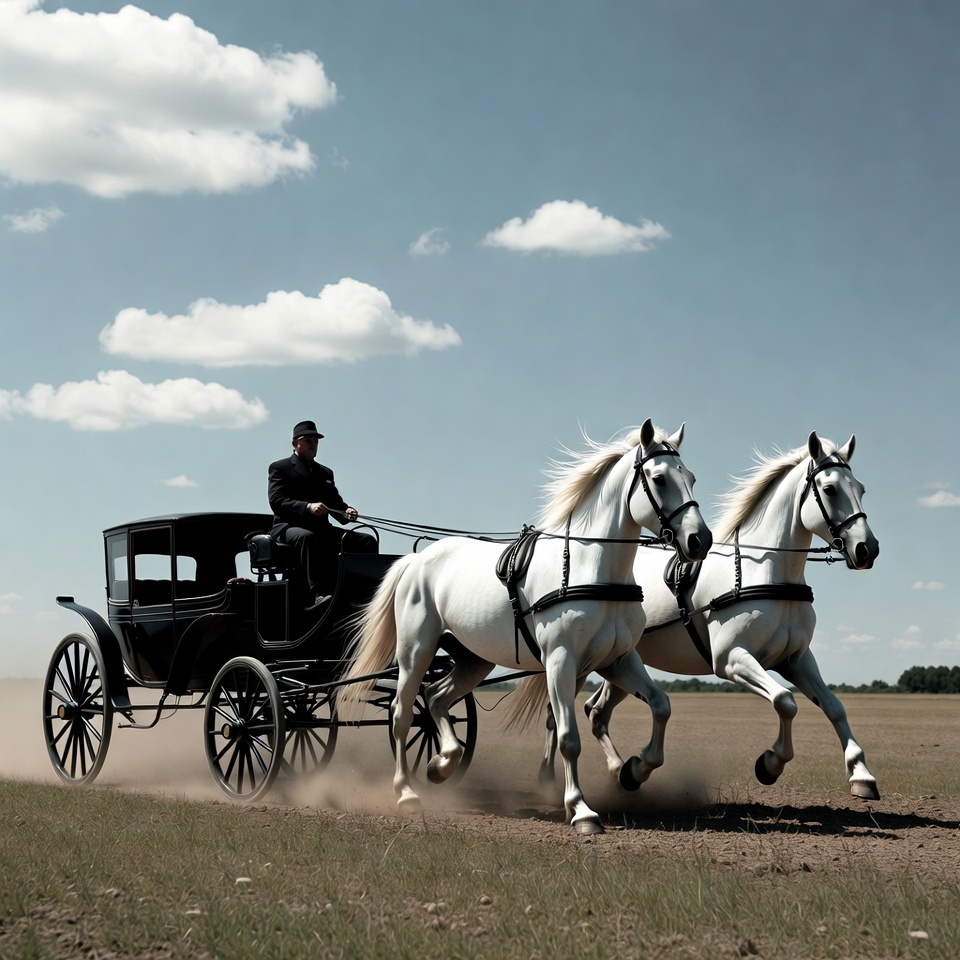 A man in a black suit and hat sits on a black vintage carriage, holding reins attached to two white horses galloping across a grassy field. The horses have flowing manes and are harnessed side by side. The scene features a clear blue sky with scattered white clouds and dust trailing behind the carriage.