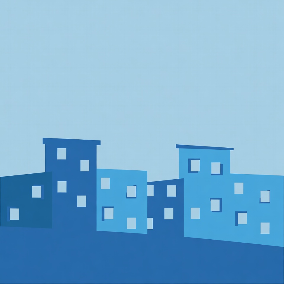 A simple vector illustration of several tall buildings in various shades of blue against a light blue sky. The buildings feature rectangular windows and flat roofs, arranged in a clustered skyline silhouette. The design uses solid colors with clean, sharp edges on an isolated background.