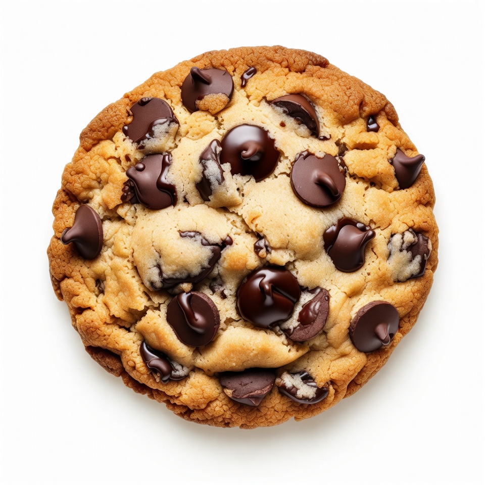baked goods, chocolate chips, cookie, dessert, dough, food photography, fresh baked, golden brown, isolated, round cookie, snack, sweet treat, top view, white background, chocolate chip cookie