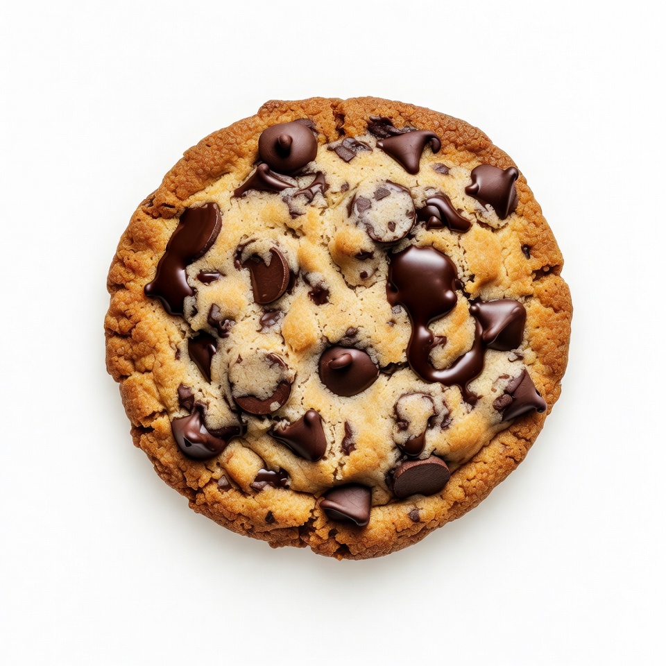 baked goods, chewy cookie, chips, chocolate, chocolate chips, cookie, delicious cookie, dessert, food, food photography, fresh baked, golden brown, gourmet cookie, isolated, round cookie, snack, top view, white background, chocolate chip cookie