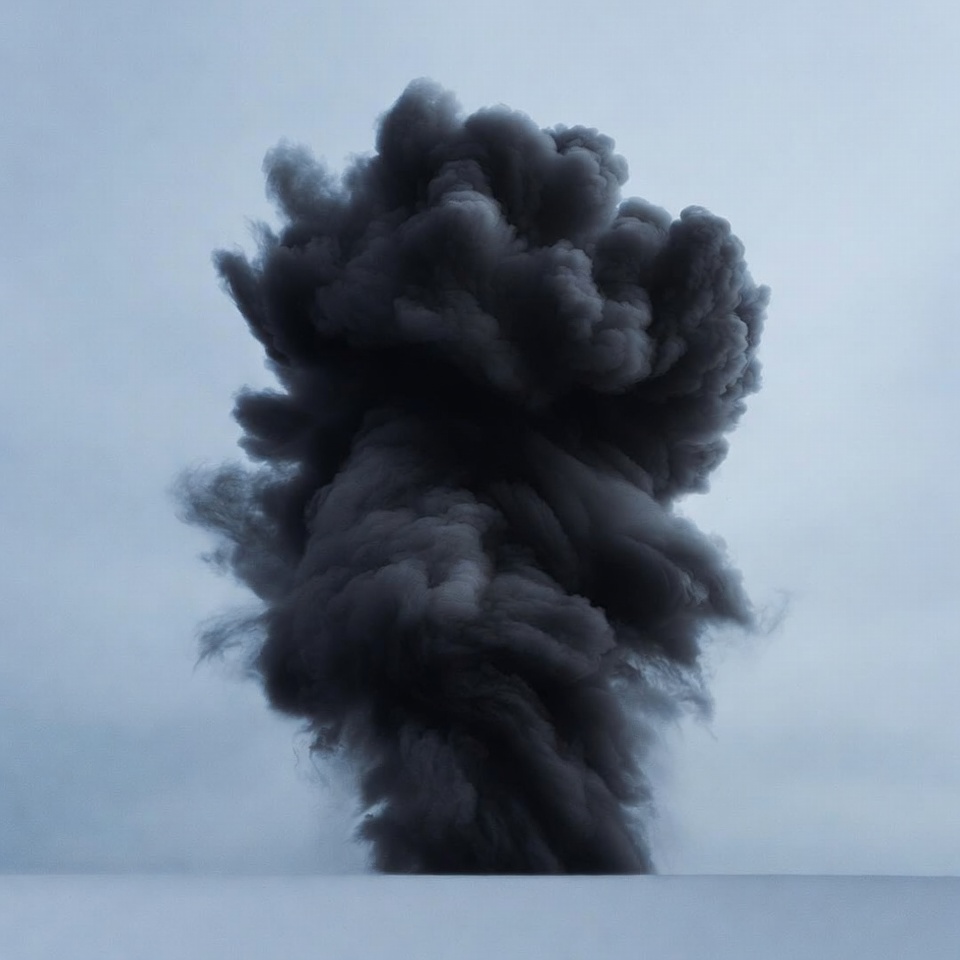 billowing smoke, black smoke, cloud, dark cloud, dense smoke, explosion, fire smoke, gray sky, isolated background, mushroom cloud, plume, rising smoke, snowy ground, volcanic eruption, smoke