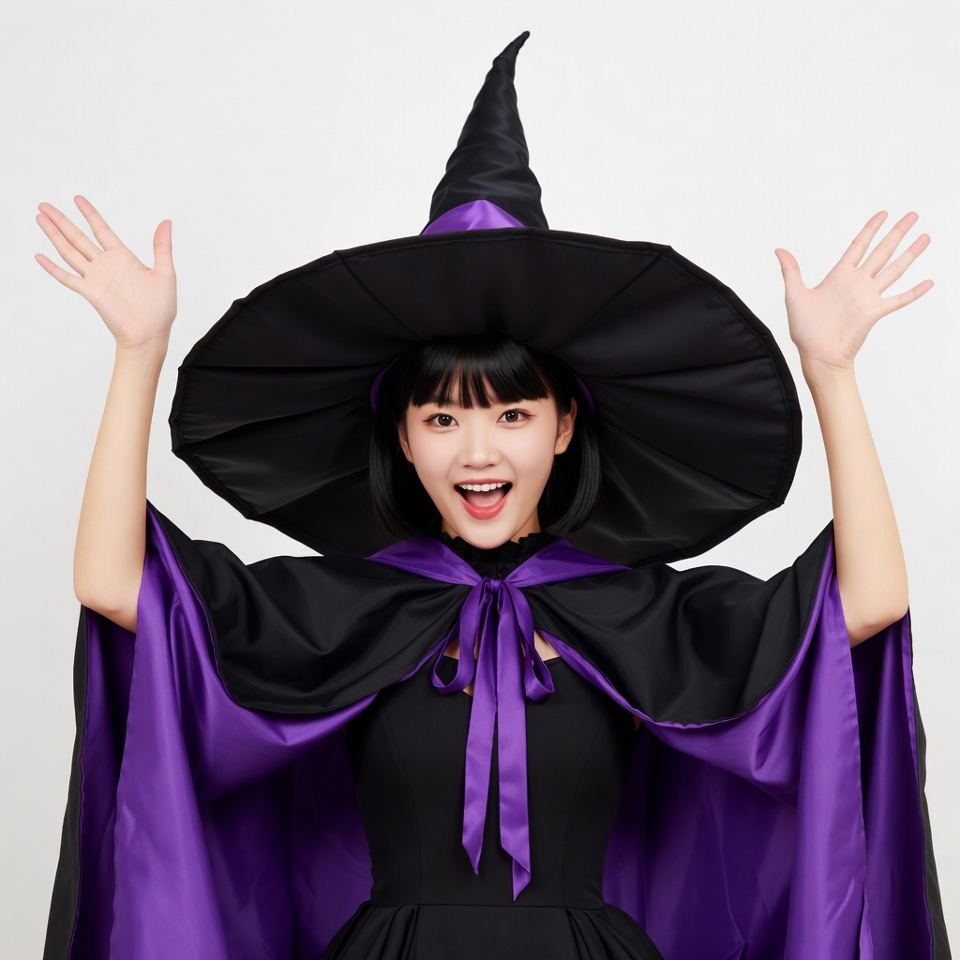A young Asian woman with short black bangs and smiling expression wears a large black pointed witch hat and purple-trimmed black cape. She raises both hands excitedly while standing against a white background. Her black dress features a purple bow at the neckline.