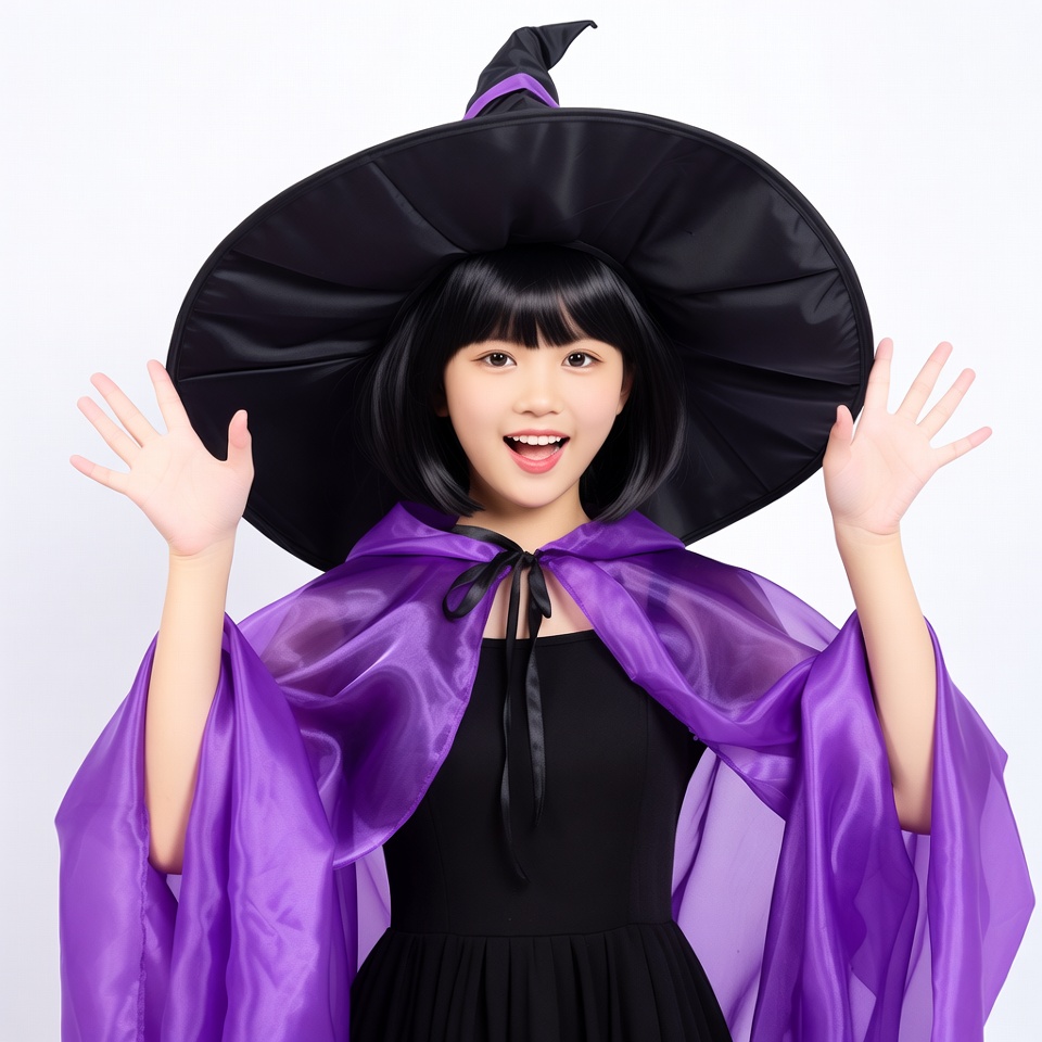 A young Asian girl with straight black bangs smiles widely while wearing a large black witch hat and a flowing purple cape over a black dress. She stands with both hands raised excitedly against a plain white background. Her costume features Halloween-themed elements like the wide-brimmed hat and sheer cape.