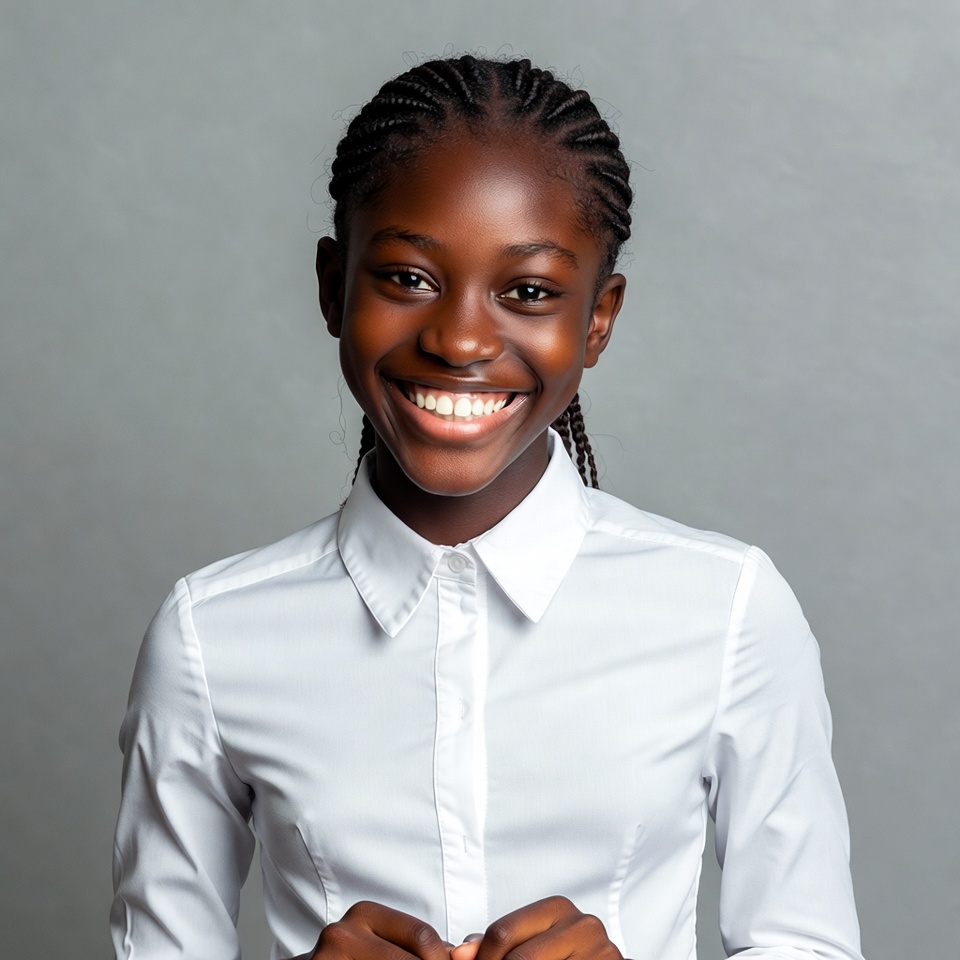 A young African girl with braided hair smiles happily at the camera against a gray background. She wears a crisp white collared shirt with long sleeves. Her hands are clasped together in front of her.