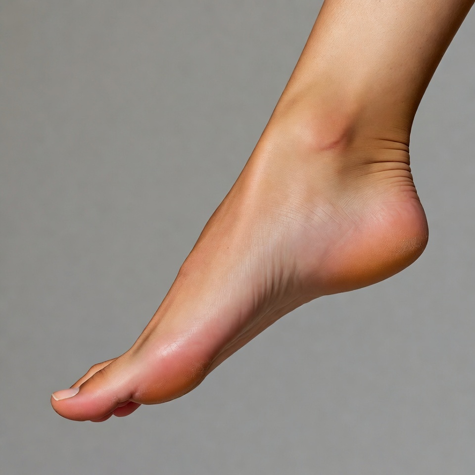 A close-up view of a woman's bare foot raised against a plain gray background. The foot shows smooth skin, defined toes, and a natural arch. Details include subtle veins and soft lighting highlighting the sole and heel.