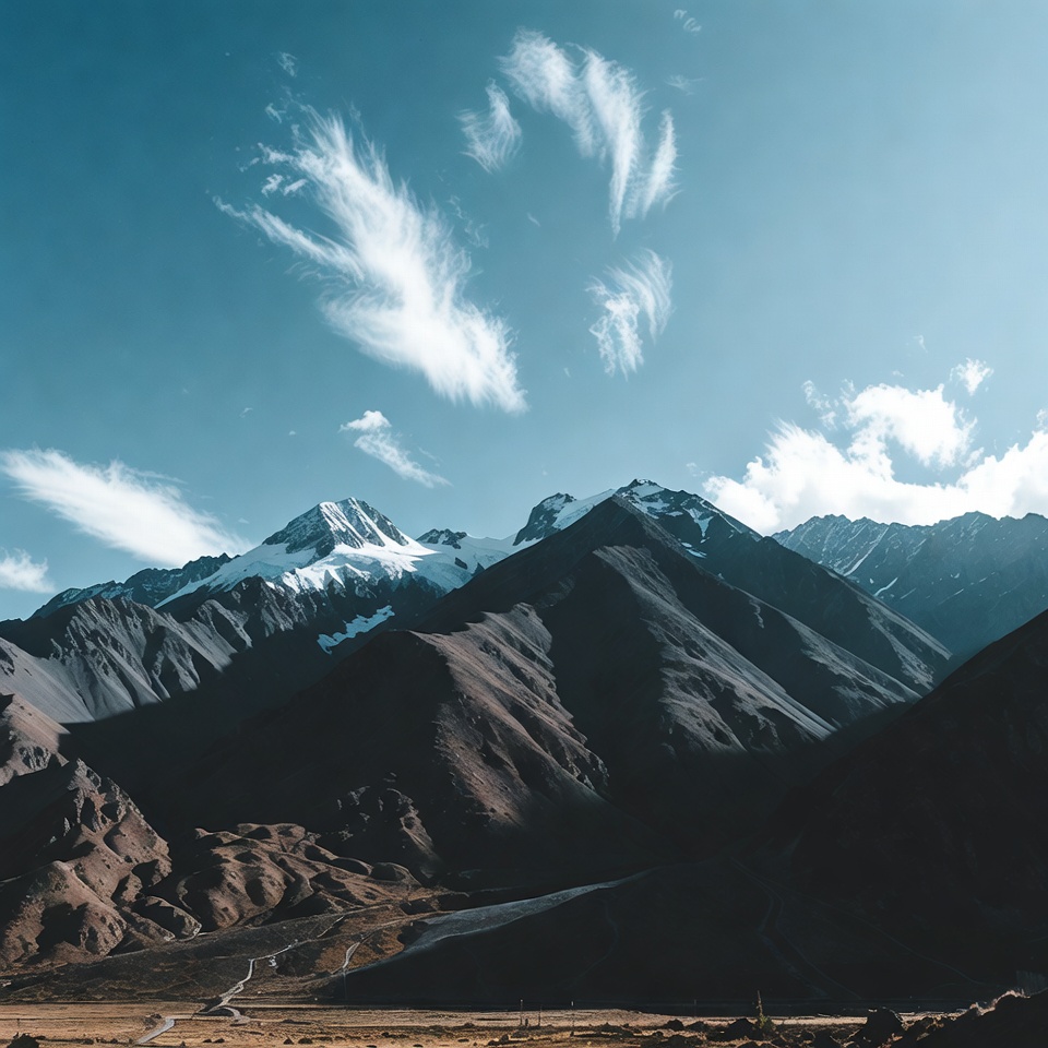 blue sky, brown earth, clouds, heart clouds, high altitude, mountain range, nature landscape, rocky slopes, rugged terrain, scenic view, snow capped, snowy peaks, valley path, white clouds, mountains