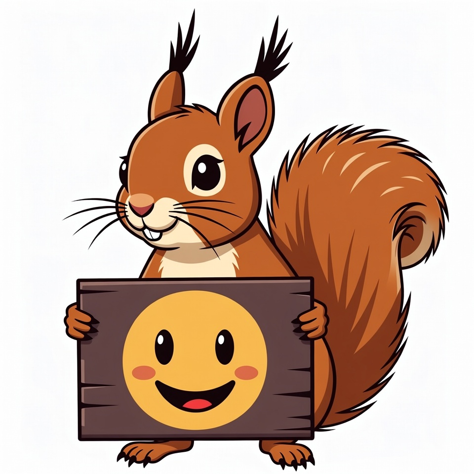 A cartoon squirrel with big eyes and fluffy tail holds a wooden sign featuring a yellow smiley face emoji. The squirrel stands on its hind legs with a cheerful expression on an isolated white background. The illustration is vibrant and playful.